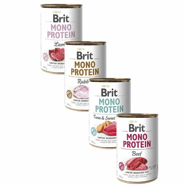 Possiamo semplicemente testare come reagisce il cane alle varie proteine e andando per esclusione eliminare tutto ciò che risulta dannoso. Dato che alcuni cani con digestione sensibile non digeriscono pezzi troppo grandi di carne o interiora, le lattine Brit Monoprotein contengono un delicato paté, più semplice da digerire e assimilare per i cani anziani che hanno problemi di denti.