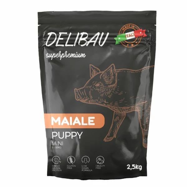 Delibau Superpremium Puppy Mini Maiale è il cibo per cani appositamente formulato per cani cuccioli di taglia piccola, entro gli 10 Kg di peso vivo. La singola fonte proteica animale (maiale) rende questo alimento per cani particolarmente digeribile, oltre che gustoso anche per il cane più esigente.
