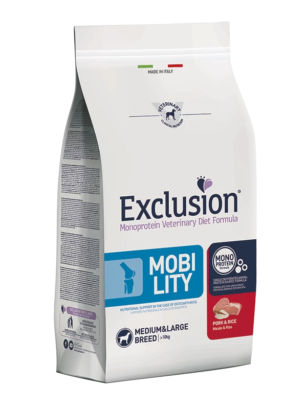 Exclusion Diet Mobility Medium/Large Breed Maiale e Riso è un alimento dietetico con formulazione monoproteica animale per favorire la mobilità articolare del cane, realizzato con un’unica fonte alternativa di proteine animali, ingredienti innovativi e preservato con tocoferoli naturali.