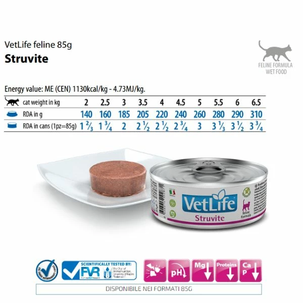 Farmina Vet Life Feline Struvite è un alimento umido dietetico destinato ai gatti, indicato per la dissoluzione calcoli da struvite e riduzione delle recidive. Acidifica urine.