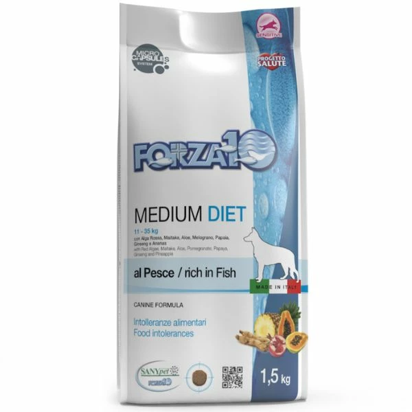 Forza10 Medium Diet al Pesce è un alimento dietetico low grain, dedicato ai cani di taglia media, completo e bilanciato, per la riduzione delle intolleranze a ingredienti e sostanze nutritive.