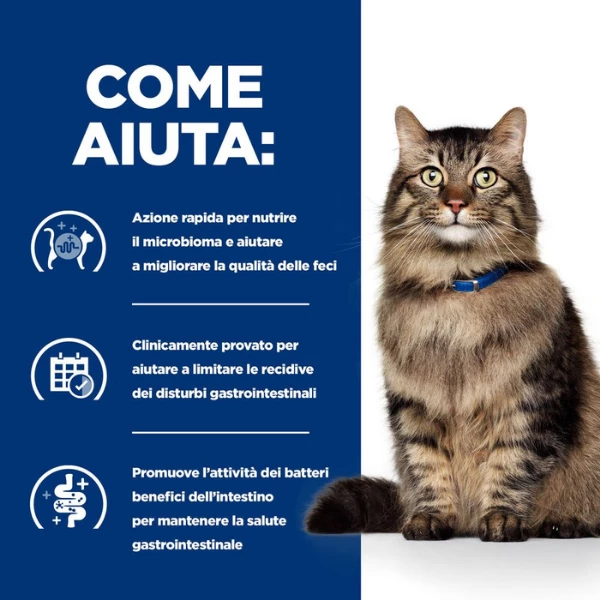 La buona notizia è che potete aiutare il vostro gatto a sentirsi meglio con un alimento che rivoluziona il modo di approcciare i problemi digestivi fibro-responsivi, ponendo la salute del microbioma intestinale – l’ecosistema intestinale specifico del vostro animale – al primo posto della salute digestiva.