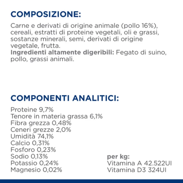 COMPOSIZIONE: carne e derivati di origine animale (pollo 16%), cereali, estratti proteici vegetali, oli e grassi, minerali, semi, derivati di origine vegetale, frutta. Ingredienti altamente digeribili: fegato di suino, pollo.