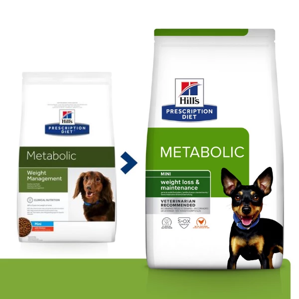 Hill’s Prescription Diet Metabolic mini Canine è l’alimento per cani con pollo è un alimento dietetico completo per la riduzione del peso corporeo in eccesso ed il mantenimento del peso ideale per i cani adulti. Questo alimento dietetico ha una bassa densità energetica. Nutrizione clinicamente provata per aiutare i cani a perdere peso rapidamente.