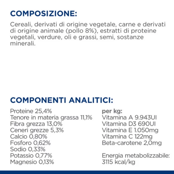 COMPOSIZIONE: Cereali, derivati di origine vegetale, carne e derivati di origine animale (pollo 8%), estratti di proteine vegetali, verdure, oli e grassi, semi, sostanze minerali.