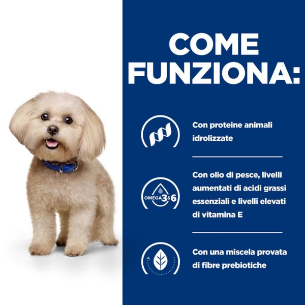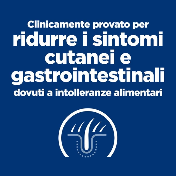 Hill’s Prescription Diet z/d mini Canine è un alimento dietetico completo ideale per cani di taglia piccola adulti/anziani, con particolari intolleranze alimentari. Questo alimento dietetico Hill’s Prescription Diet contiene una fonte selezionata di carboidrati e una fonte di proteine idrolisate. Nutrizione clinicamente testata per ridurre i segni cutanei e gastrointestinali causati dalle intolleranze alimentari. Le sensibilità e le intolleranze alimentari sono problemi potenzialmente gravi che possono provocare irritazioni della pelle, del pelo e delle orecchie o persino disturbi gastrointestinali. I cani che hanno reazioni avverse al cibo dovute a un’allergia alimentare (tipicamente a una proteina nel cibo) o un’intolleranza traggono beneficio da un alimento progettato per le sensibilità alimentari.
