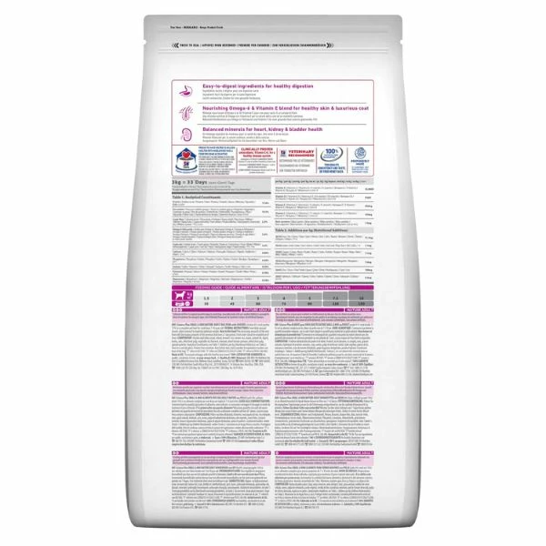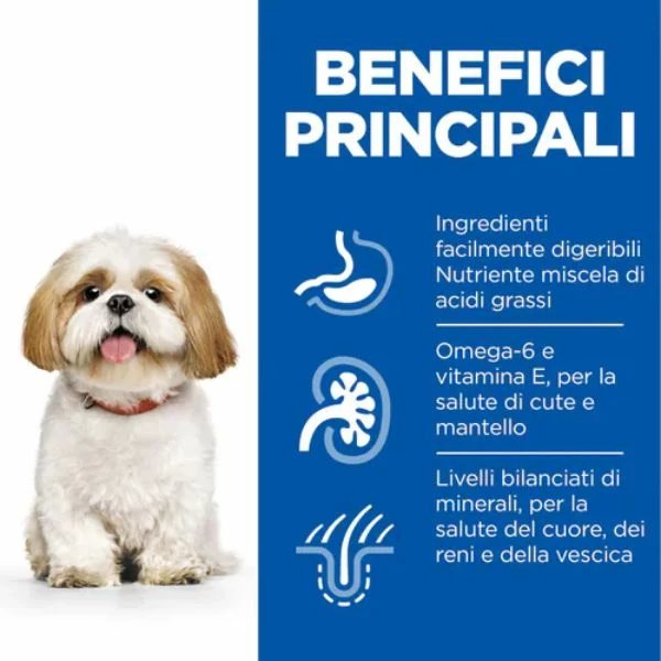- NON raccomandato per Cuccioli, o cani adulti sotto i 7 anni di età, e femmine in gravidanza e in allattamento. Durante la gravidanza e l’allattamento, le cagne dovrebbero passare all’alimento per cuccioli Hill’s Science Plan Puppy Small&Mini