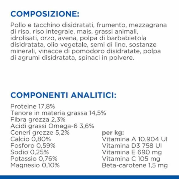 COMPOSIZIONE: pollo 8%, pollame 13%, Pollo e tacchino disidratati, frumento, mezzagrana di riso, riso integrale, mais, grassi animali, idrolisati, orzo, avena, polpa di barbabietola disidratata, olio vegetale, semi di lino, sostanze minerali, vinacce di pomodoro disidratate, polpa di agrumi disidratata, spinaci in polvere.