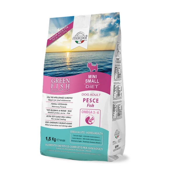 Marpet Green Fish Adult Mini cane Pesce è l’alimento secco fonte di Omega 3 e Omega 6 con solo proteine di pesce fersco pescato. L’unione del pesce e del riso, associati ad una integrazione di piante specifiche depurative e disintossicanti come Cardo Mariano, Carciofo e Rosmarino, rende Greenfish una formula unica ed adatta a molteplici esigenze.