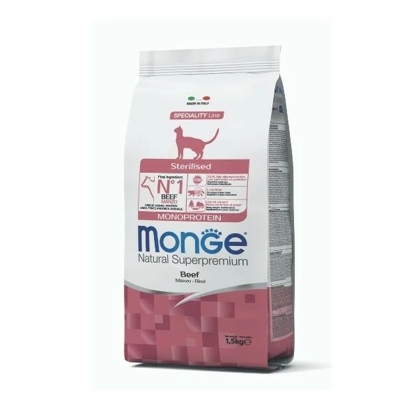 Monge Natural Superpremium Monoprotein Gatto sterilizzato Manzo è un alimento completo e bilanciato per gatti adulti. Formulato appositamente per il tuo gatto adulto sterilizzato grazie alla presenza di un basso contenuto di grassi per favorire il mantenimento del peso corporeo ideale e con L-Carnitina per il supporto della massa muscolare.