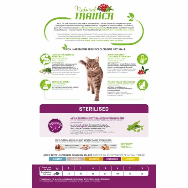 Trainer Natural Adult Sterilised con Prosciutto Crudo è un alimento secco completo per gatti sterilizzati da un anno d’età. Ideale anche per gatti pigri o che vivono esclusivamente in casa. La carne fresca di pollo e tacchino unita al prosciutto crudo 100% italiano consente di offrire un alimento altamente appetibile e dall’ottimale profilo proteico.