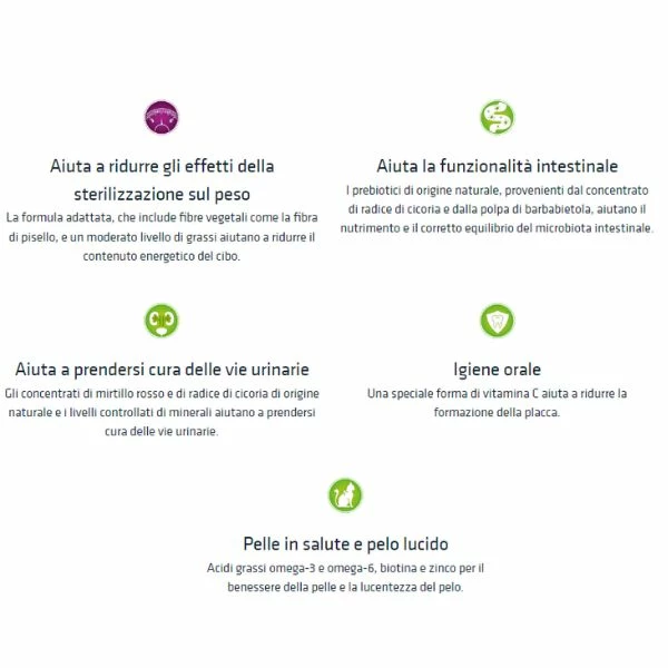 – Aiuta a ridurre gli effetti della sterilizzazione sul peso. La formula adattata, che include fibre vegetali come la fibra di pisello, e un moderato livello di grassi aiutano a ridurre il contenuto energetico del cibo.