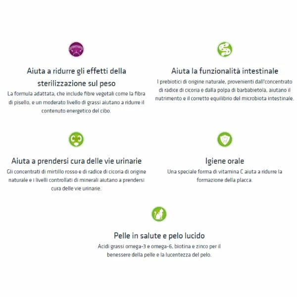 La moderna formulazione rende ora possibile assecondare l’istinto ancestrale del gatto a cambiare gusto alternando le diverse referenze “Adult Sterilised” in tutta libertà e sicurezza, senza effettuare un passaggio graduale (Trainer® Safe Transition). Gli estratti secchi di Propoli, Menta piperita e di mela (AppleZin ) aiutano a mantenere una corretta igiene orale. L’estratto di Mirtillo rosso ed il contenuto apporto di Fosforo e Magnesio aiutano a preservare nel tempo la funzionalità delle vie urinarie.