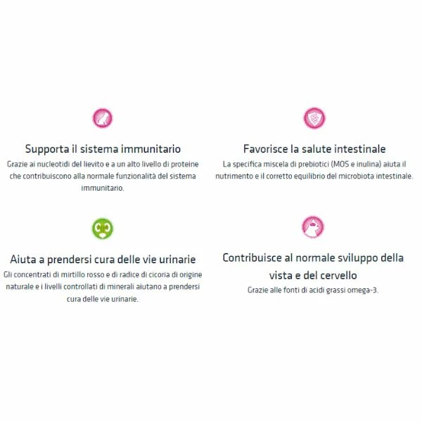 - Favorisce la salute intestinale. La specifica miscela di prebiotici (MOS e inulina) aiuta il nutrimento e il corretto equilibrio del microbiota intestinale.