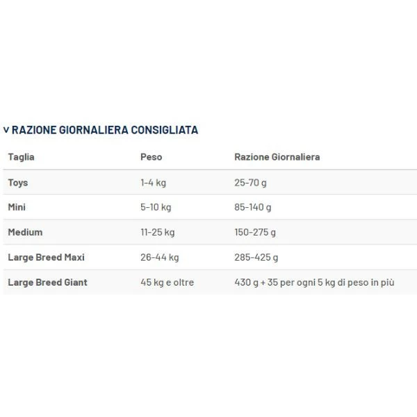 | Taglia del cane | Peso | Razione giornaliera |