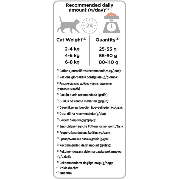 I livelli di proteine, grassi e carboidrati sono stati appositamente adattati per aiutare a mantenere il peso corporeo ideale nei gatti sterilizzati.