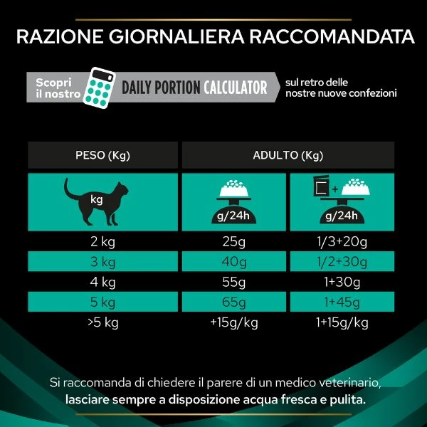 Razione giornaliera consigliata: vedi immagine illustrativa in gallery. Usare Feline EN da 1 a 2 settimane durante le diarree acute e/o fino alla ripresa completa. Al fine di ottimizzare la funzione digestiva la dose giornaliera deve essere suddivisa in una serie di piccoli pasti. Si raccomanda di chiedere il parere di un veterinario prima dell’uso oppure prima di estendere il periodo di impiego e per la guida all’alimentazione dei gattini. Si raccomanda acqua a volontà. Disponibile anche in formato umido.
