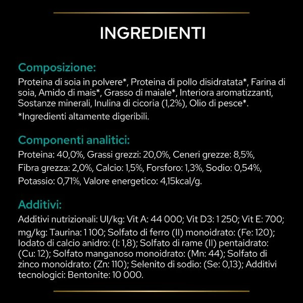 Composizione: Proteina di soia in polvere*, Proteina di pollo disidratata*, Farina di soia, Amido di mais*, Grasso di maiale*, Interiora aromatizzanti, Sostanze minerali, Inulina di cicoria (1.2%), Olio di pesce*. *Ingredienti altamente digeribili