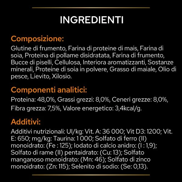 Componenti analitici: Proteina: 48.0%, Grassi grezzi: 8.0%, Ceneri grezze: 8.0%, Fibra grezza: 7.5%, Valore energetico (3.4 kcal/g)
