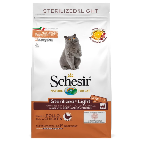 Schesir Cat Dry Sterilized and Light è un alimento secco per gatti adulti a base di pollo specificamente studiato per soggetti sterilizzati o con tendenza al sovrappeso. Una ricetta Schesir che ha come primo ingrediente il pollo, che costituisce l’unica fonte proteica animale del prodotto: un gustoso alimento completo e bilanciato, facilmente digeribile, che soddisfa le esigenze nutrizionali dei gatti adulti sterilizzati. Il basso contenuto di grassi e l’elevato contenuto in fibre, rispetto al prodotto di mantenimento, contribuiscono a mantenere il giusto peso del gatto.