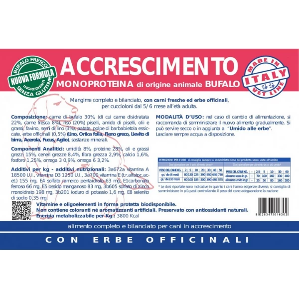 Vet Line Secco Monoproteico Cane Junior Accrescimento Bufalo è il mangime secco completo e bilanciato, con carni fresche ed erbe officinali, per cuccioloni/junior in fase di crescita, superato il 5° mese di vita, verso l’età adulta.